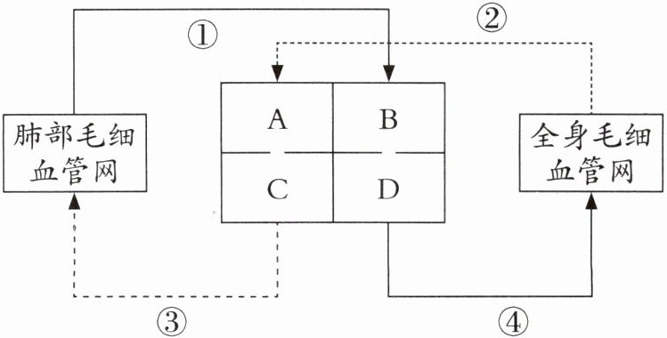 15. 下图为人体血液循环简图,其中A~D表示心脏的四个腔,①~④表示血管。下列说法正确的是 ()