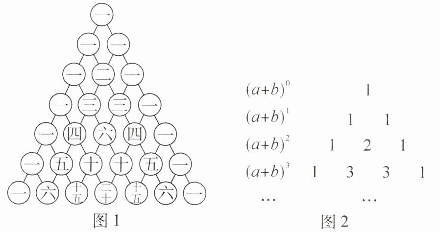 素材1:杨辉是我国南宋时期杰出的数学家,在其所著的《详解九章算法》中记载了如图1所示的源于北宋时期数学家贾宪的"开方作法本源图",我们把这个图叫作"杨辉三角".