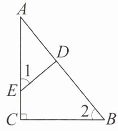 1. (新教材P14 T2)如图,在$ \triangle ABC $中,$ \angle C = 90 ^ { \circ } $,点D,E分别在边AB,AC上,且$ \angle 1 = \angle 2 $,$ \triangle ADE $是直角三角形吗?为什么?