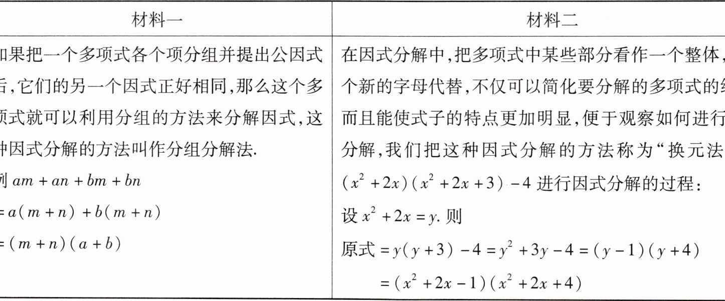 | 如果把一个多项式各个项分组并提出公因式后,它们的另一个因式正好相同,那么这个多项式就可以利用分组的方法来分解因式,这种因式分解的方法叫作分组分解法。例 $ am + an + bm + bn $ $ = a(m + n) + b(m + n) $ $ = (m + n)(a + b) $ | 在因式分解中,把多项式中某些部分看作一个整体,用一个新的字母代替,不仅可以简化要分解的多项式的结构,而且能使式子的特点更加明显,便于观察如何进行因式分解,我们把这种因式分解的方法称为“换元法”。例 $ (x^{2} + 2x)(x^{2} + 2x + 3) - 4 $ 进行因式分解的过程:设 $ x^{2} + 2x = y $。则原式 $ = y(y + 3) - 4 = y^{2} + 3y - 4 = (y - 1)(y + 4) $ $ = (x^{2} + 2x - 1)(x^{2} + 2x + 4) $ |