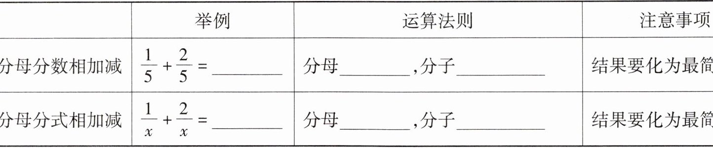 | 同分母分式相加减 | $\frac{1}{x}+\frac{2}{x}= $______ | 分母______,分子______ | 结果要化为最简分式 |