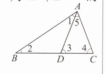 12. 如图,在$\triangle ABC$中,点$D在BC$上,$\angle 1= \angle 2$,$\angle 3= \angle 4$,$\angle 5= 40^{\circ}$,求$\angle 1$,$\angle BAC$的度数。