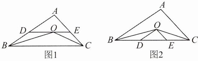 16. 如图 1,在$△ABC$中,BO 平分$∠ABC$,CO 平分$∠ACB$,过点 O 作$DE// BC$,交 AB 于点 D,交 AC 于点 E.