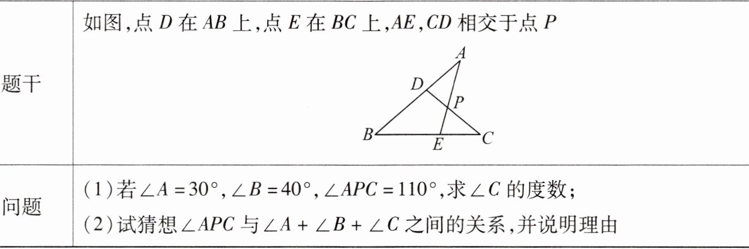 |问题|(1)若$∠A= 30^{\circ },∠B= 40^{\circ },∠APC= 110^{\circ }$,求$∠C$的度数;|