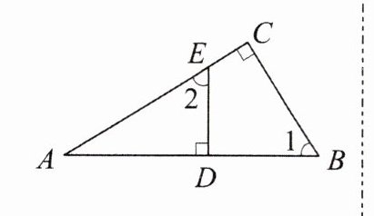 1. 如图,在$Rt△ABC$中,$∠C= 90^{\circ }$,$DE⊥AB$于点D. 求证:$∠1= ∠2$.