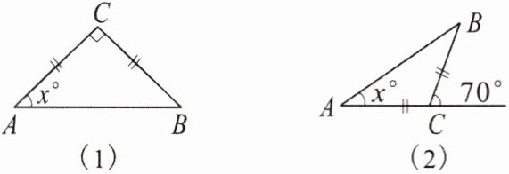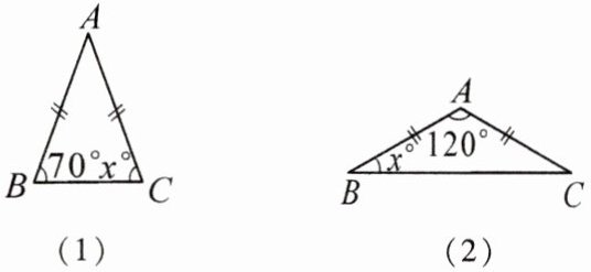 2. 例(新教材P79 T1改编)如图,已知$AB= AC$,求各图中的$x$.