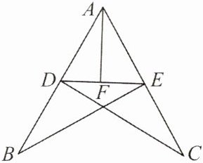10. 如图,$AB= AC,∠B= ∠C$,点D,E分别在AB,AC上,F是DE的中点。求证: