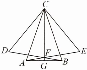 11. (新教材P93 T13)如图,$\triangle ABC$是等腰三角形,$AC= BC$,$\triangle BCD和\triangle ACE$是等边三角形,$AE与BD相交于点F$,连接$CF$并延长,交$AB于点G$.求证:$G为AB$的中点.