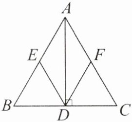4. (新教材 P82 T2)如图,在等边三角形 ABC中,AD是 BC上的高,$∠BDE= ∠CDF= 60^{\circ },$图中有哪些与 BD 相等的线段?证明你的结论.