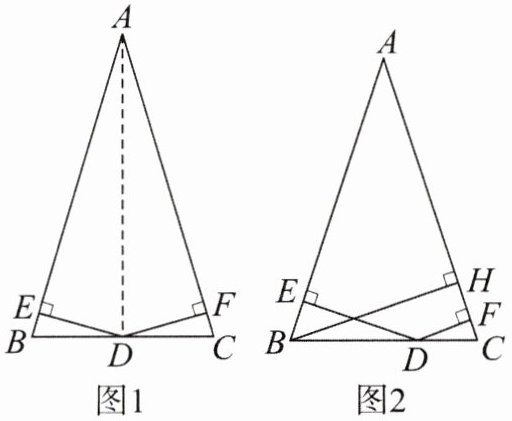 【拓展 2】如图 2,$AB= AC$,D 为底边 BC 上任意一点,$DE⊥AB$于点 E,$DF⊥AC$于点 F,$BH⊥AC$于点 H. 求证:$DE+DF= BH$.