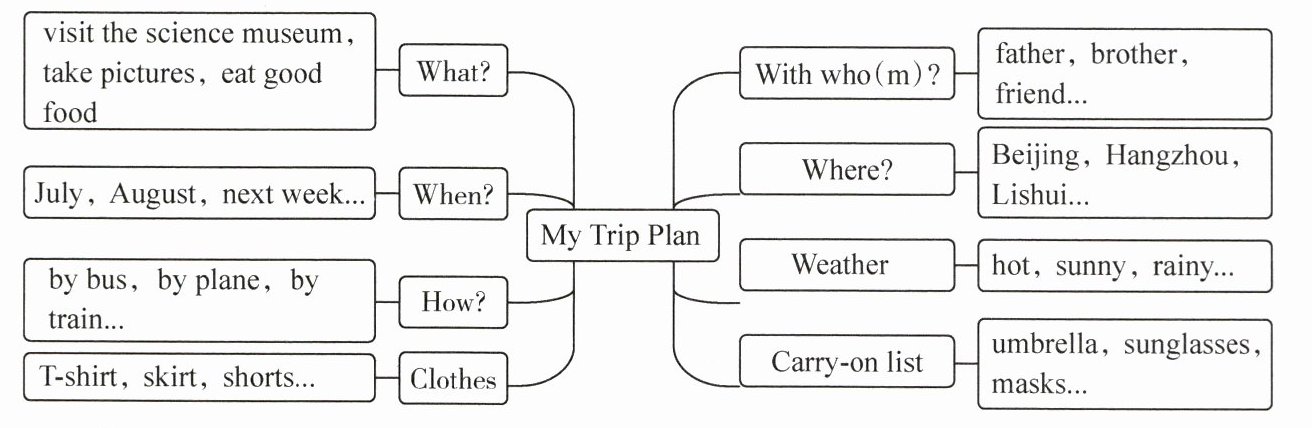参考思维导图内容,也可以根据自己的计划适当发挥,以“My Trip Plan”为题,写一篇小短文。
