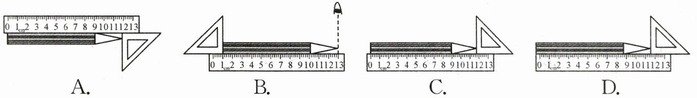 例1 如图所示,用刻度尺测量铅笔的长度。测量方法正确的是(