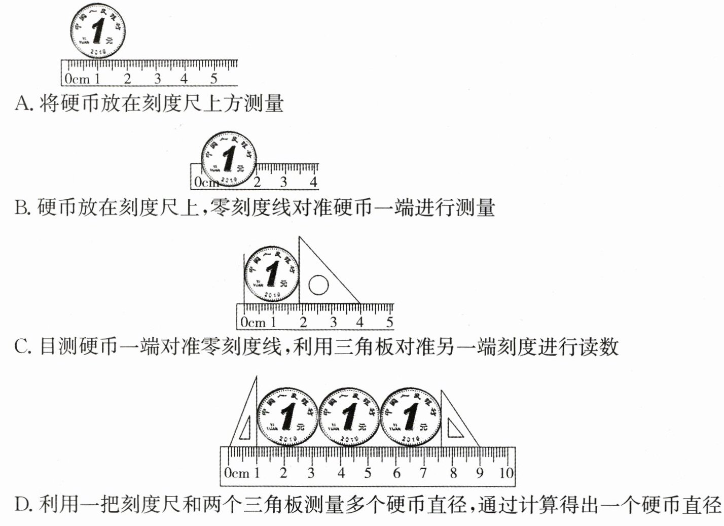 5. 2019年版第五套人民币于2019年8月30日起发行,小鹭目测新版1元硬币的直径比旧版小,想测量其直径。如图中测量方案最佳的是(