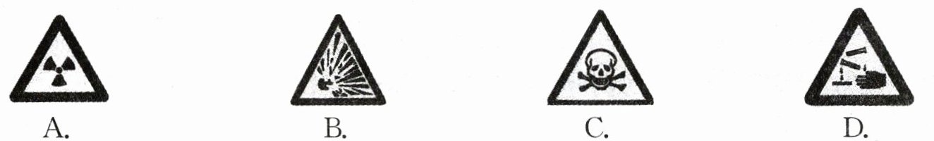 4. 实验室内有一些危险品存放于特别指定的地点,危险品的容器外有相应的警告标志。图中警告标志表示有毒的是(