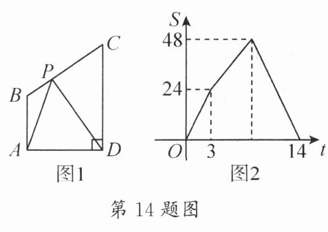 14. 如图1,四边形$ABCD$中,$AB// CD$,$\angle ADC = 90^{\circ}$,点$P$从点$A$出发,以每秒两个单位长度的速度,按$A - B - C - D$的顺序在边上匀速运动,设点$P$的运动时间为$t$秒,$\triangle PAD$的面积为$S$,$S$关于$t$的函数图象如图所示,当点$P$运动____