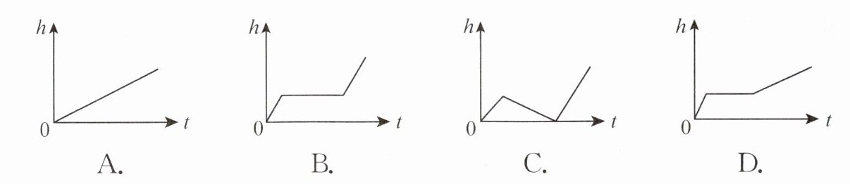 D [解析]注水管向小玻璃杯内注水,水面在逐渐升高,当注满玻璃杯后,水开始向鱼缸内流,此时最高水位不变,直到鱼缸水面高度与玻璃杯水面高度相同;当鱼缸水面高度与玻璃杯水面高度一样后,再继续注水,水位继续升高,但升高的速度变慢。故选:D。