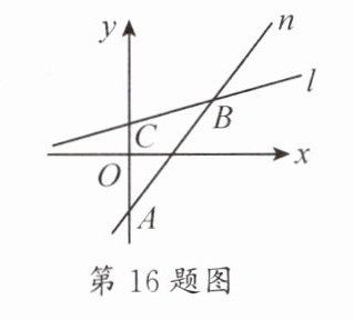 16. 在如图所示的平面直角坐标系中,直线$n$过点$A(0,-2)$且与直线$l$交于点$B(3,2)$,直线$l$与$y$轴正半轴交于点$C$.
