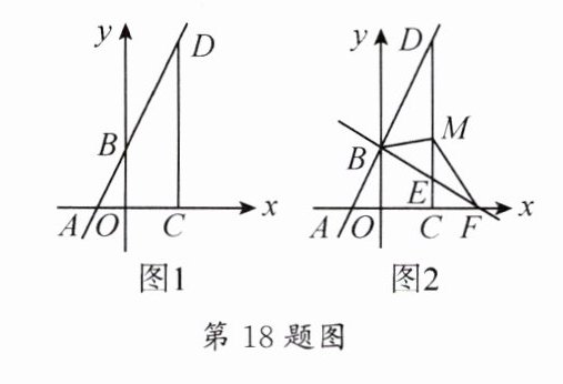 18. 如图1,在平面直角坐标系中,直线$y = kx + b$分别与$x$轴,$y$轴交于点$A(-1,0)$,$B(0,2)$,过点$C(2,0)$作$x$轴的垂线,与直线$AB$交于点$D$.