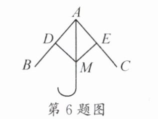 6. 如图是雨伞在开合过程中某时刻的截面图,伞骨$AB = AC$,$D$,$E$分别是$AB$,$AC$的中点,$DM$,$EM$是连接弹簧和伞骨的支架,且$DM = EM$,已知弹簧$M$在向上滑动的过程中,总有$\triangle ADM\cong \triangle AEM$,其判定依据是 ………… (