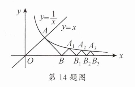 14. 如图,一次函数$y=x$与反比例函数$y=\frac {1}{x}(x>0)$的图象交于点$A$,过点$A$作$AB⊥OA$,交$x$轴于点$B$;作$BA_{1}// OA$,交反比例函数图象于点$A_{1}$;过点$A_{1}$作$A_{1}B_{1}⊥A_{1}B$交$x$轴于点$B_{1}$;再作$B_{1}A_{2}// BA_{1}$,交反比例函数图象于点$A_{2}$,依次进行下去……则点$A_{2024}$的横坐标为