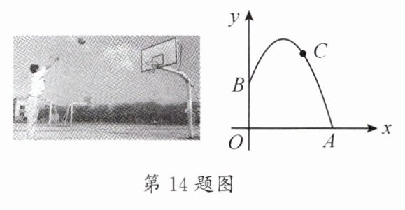 14. 王刚在练习投篮,篮球脱手后的运动轨迹近似为如图所示的抛物线 $ y = - 0.2 x ^ { 2 } + x + 2.25 $,已知篮圈高3.05米,王刚投篮时出手高度 $ OB $ 为2.25米,若要使篮球刚好投进篮圈 $ C $,则投篮时王刚离篮圈中心的水平距离为