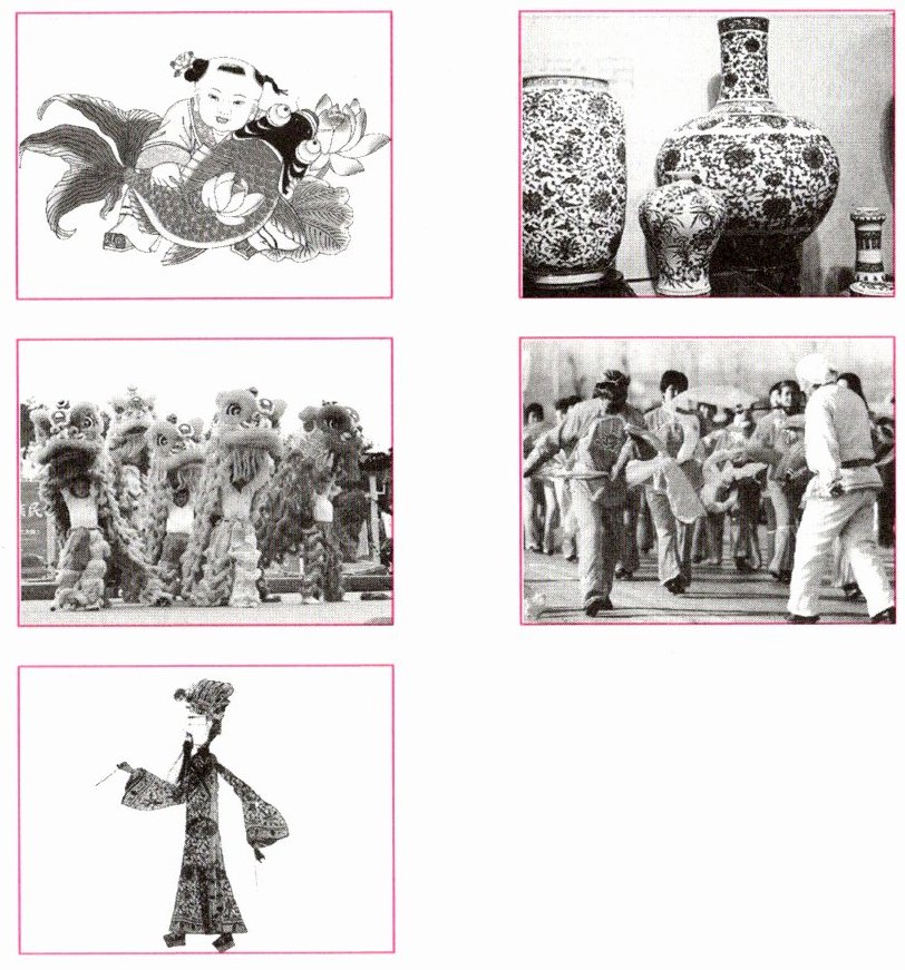 四川绵竹年画、江西景德镇瓷器、广东舞狮、东北秧歌、陕西华县皮影。