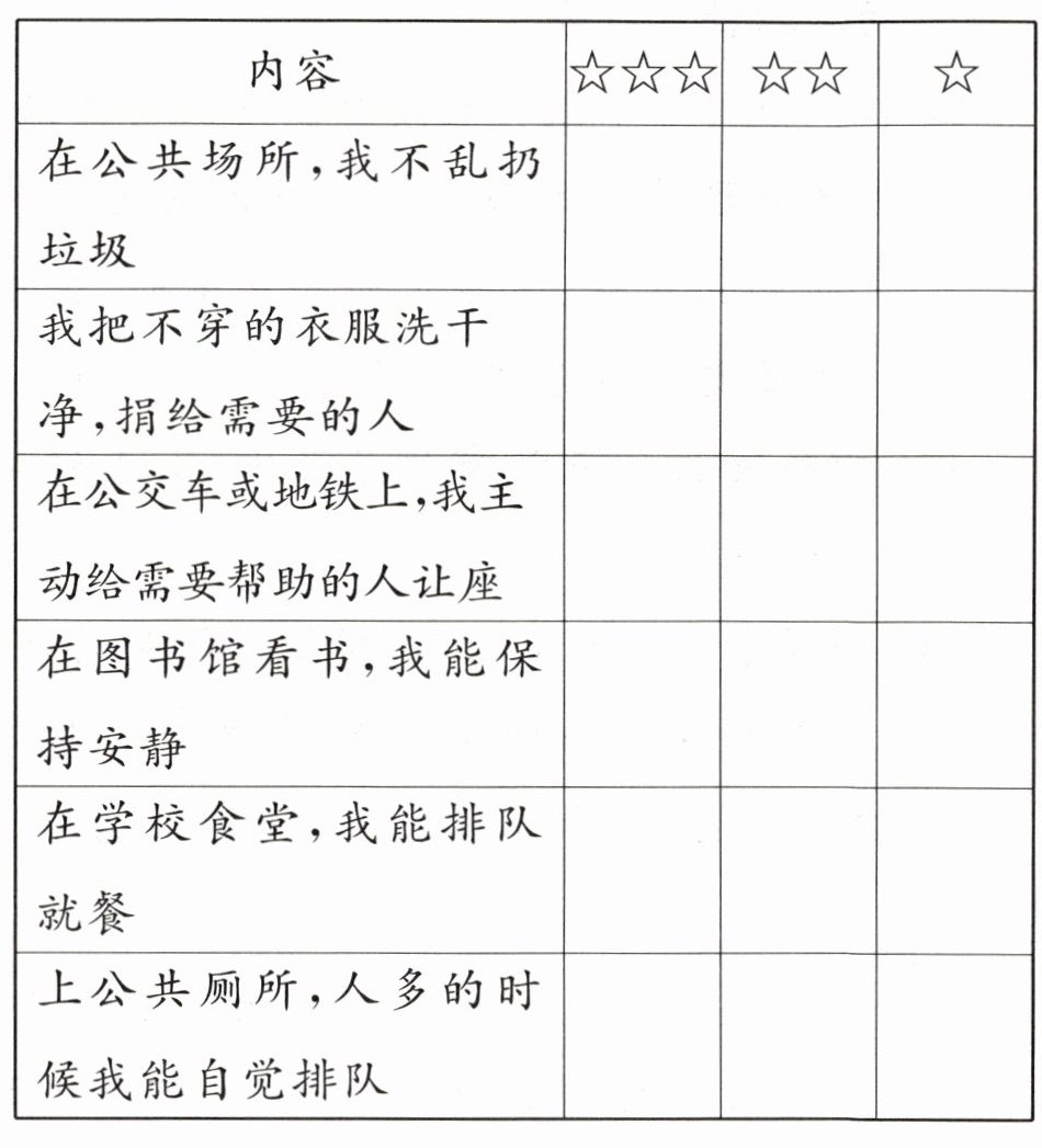 根据个人实际情况在对应行为的“☆☆☆”“☆☆”“☆”栏中进行选择涂色。例如,若在公共场所一直不乱扔垃圾,就在“在公共场所,我不乱扔垃圾”对应的“☆☆☆”栏涂颜色;若只是大部分时候能把不穿的衣服洗干净捐给需要的人,就在“我把不穿的衣服洗干净,捐给需要的人”对应的“☆☆”栏涂颜色等。