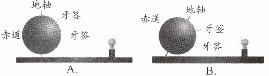 3. 下列模拟实验中,绕着灯泡旋转一周,赤道和北半球上牙签影子的长短没有发生变化的是(