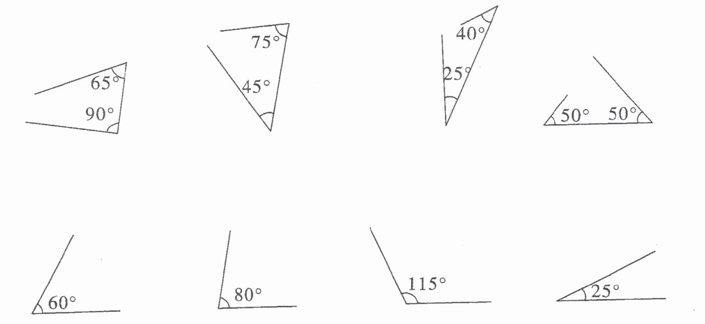 1. 第一个三角形:三角形内角和为$180^{\circ}$,已知两个角分别是$65^{\circ}$和$90^{\circ}$,则丢失的角为$180 - 65 - 90 = 25^{\circ}$,与下面$25^{\circ}$相连。