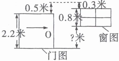 然后看窗图,窗图中从虚线到窗户顶部是$0.3$米,窗户自身高度是$0.8$米,要求窗户离地面的高度,就用从地面到虚线的总高度减去(窗户顶部到虚线的距离加上窗户自身高度),列式为$2.2 + 0.5-(0.3 + 0.8)$。