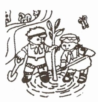 春天到了,小朋友们在郊外植树。他们先挖好树坑,再把小树苗放进树坑,然后填上土,最后给小树苗浇水。