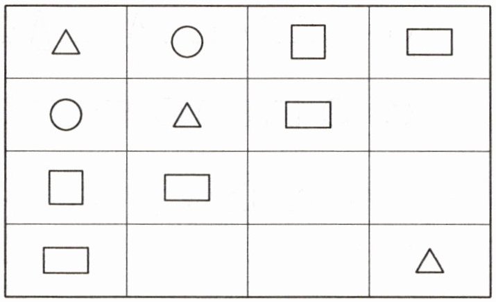 第三行第三列画圆形,第三行第四列画正方形,第四行第二列画圆形,第四行第三列画三角形。(由于无法直接绘制图形,用文字表述答案,按照表格从左到右、从上到下的顺序,空的格子依次为:第三行第三列“○”,第三行第四列“□”,第四行第二列“○”,第四行第三列“△”)
