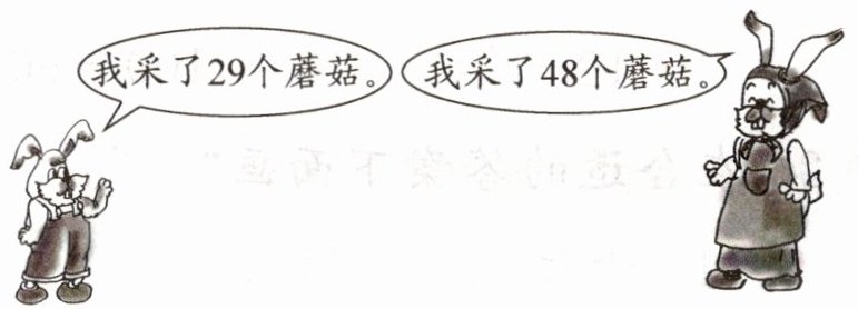 (1) 求兔妈妈和兔宝宝一共采的蘑菇数,就是将兔妈妈采的蘑菇数与兔宝宝采的蘑菇数相加,即$29 + 48$。计算$29+48$时,先算$20 + 40 = 60$,再算$9 + 8 = 17$,最后$60+17 = 77$(个)。