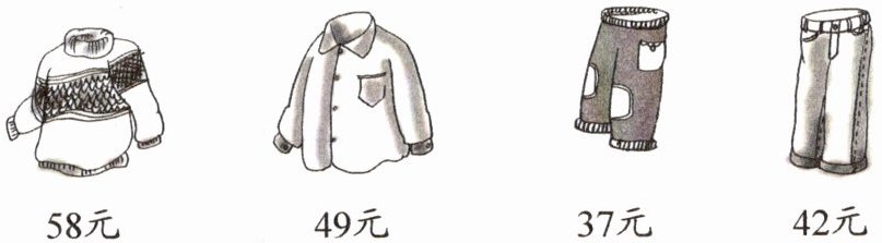 要计算最少用多少钱,就需要选择价格最低的上衣和价格最低的裤子。上衣中$49$元小于$58$元,裤子中$37$元小于$42$元,所以最少花费$49 + 37$元。