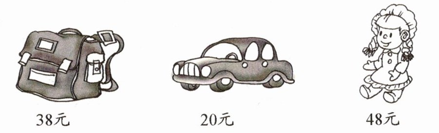 (1) 求一个书包和一个布娃娃一共多少元,就是把书包的价格$38$元与布娃娃的价格$48$元相加,即$38 + 48$。计算$38+48$时,先算$30 + 40 = 70$,再算$8 + 8 = 16$,最后$70+16 = 86$(元)。