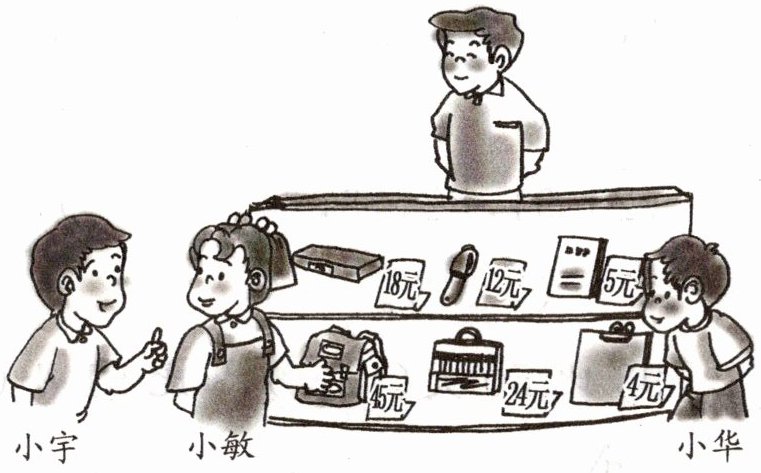 (1)一个书包$45$元,一盒水彩笔$24$元,小宇应付的钱数是两者价格之和,即$45 + 24=69$(元)。