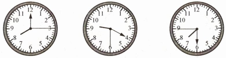 2. 第一个钟面:时针指向$8$,分针指向$12$,秒针指向$3$(一大格是$5$秒,$3\times5=15$秒),表示$8:00:15$;第二个钟面:时针在$9$和$10$之间,分针指向$4$($4\times5 = 20$分),秒针指向$6$($6\times5=30$秒),表示$9:20:30$;第三个钟面:时针在$7$和$8$之间,分针指向$6$($6\times5 = 30$分),秒针指向$9$($9\times5=45$秒),表示$7:30:45$。