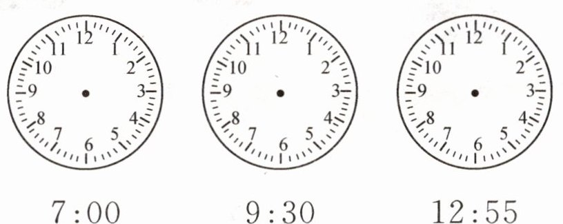 1. $7:00$时针指向$7$,分针指向$12$;$9:30$时针在$9$、$10$中间,分针指向$6$;$12:55$时针接近$1$,分针指向$11$。