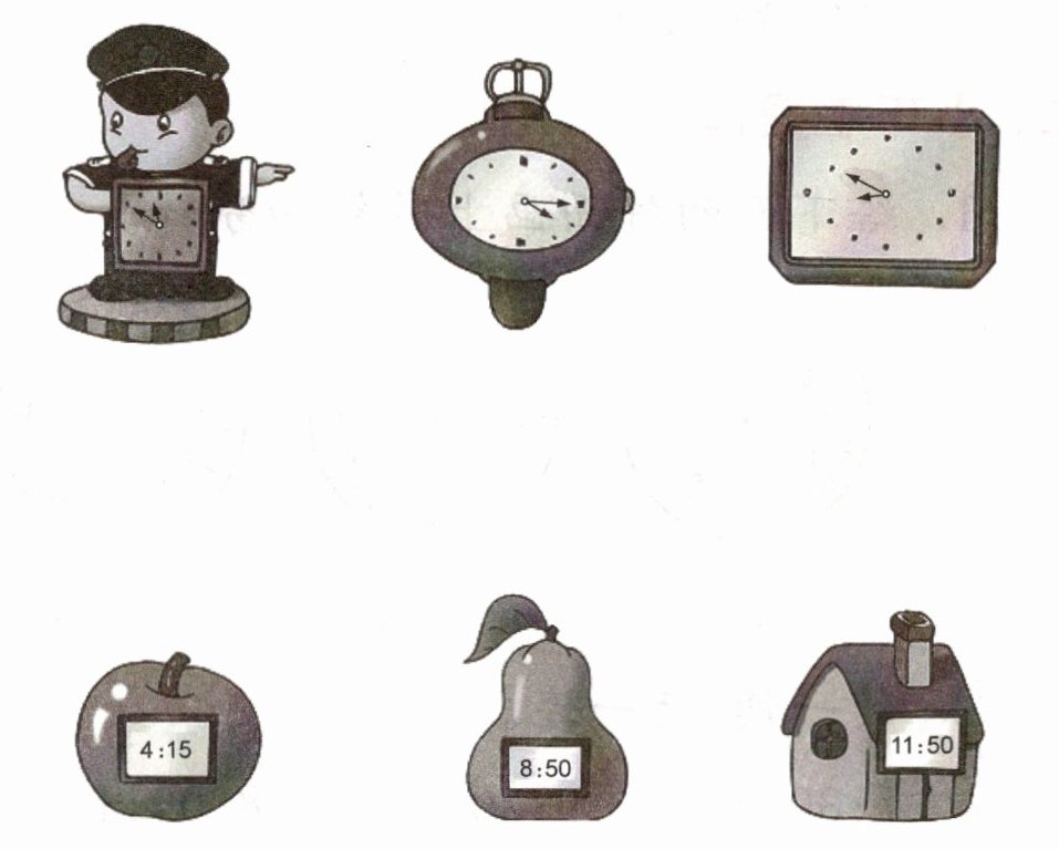 【答案】:第一个钟表连梨($8:50$);第二个钟表连苹果($4:15$);第三个钟表连房子($11:50$)。