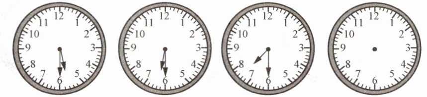 【解析】:观察前面三个钟表,时针依次指向$5$、$6$、$7$,每次增加$1$小时;分针始终指向$6$,表示$30$分。所以下一个钟表时针应指向$8$,分针指向$6$。