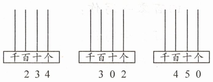 【答案】:$234$读作二百三十四,画计数器:千位$0$个珠子,百位$2$个珠子,十位$3$个珠子,个位$4$个珠子;$302$读作三百零二,画计数器:千位$0$个珠子,百位$3$个珠子,十位$0$个珠子,个位$2$个珠子;$450$读作四百五十,画计数器:千位$0$个珠子,百位$4$个珠子,十位$5$个珠子,个位$0$个珠子。