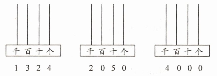 【解析】:由于题目要求“读一读,画一画”,但未明确画的具体要求和方式,推测是要读出这些数。读数时,从高位读起,千位是几就读几千,百位是几就读几百,十位是几就读几十,个位是几就读几,中间有一个 0 或两个 0,只读一个“零”,末尾不管有几个 0,都不读。1324 读作一千三百二十四;2050 读作二千零五十;4000 读作四千。