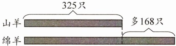 【解析】:先求出绵羊的数量,绵羊比山羊多$168$只,所以绵羊有$325 + 168 = 493$只。再求山羊和绵羊总数,即$325+493 = 818$只。