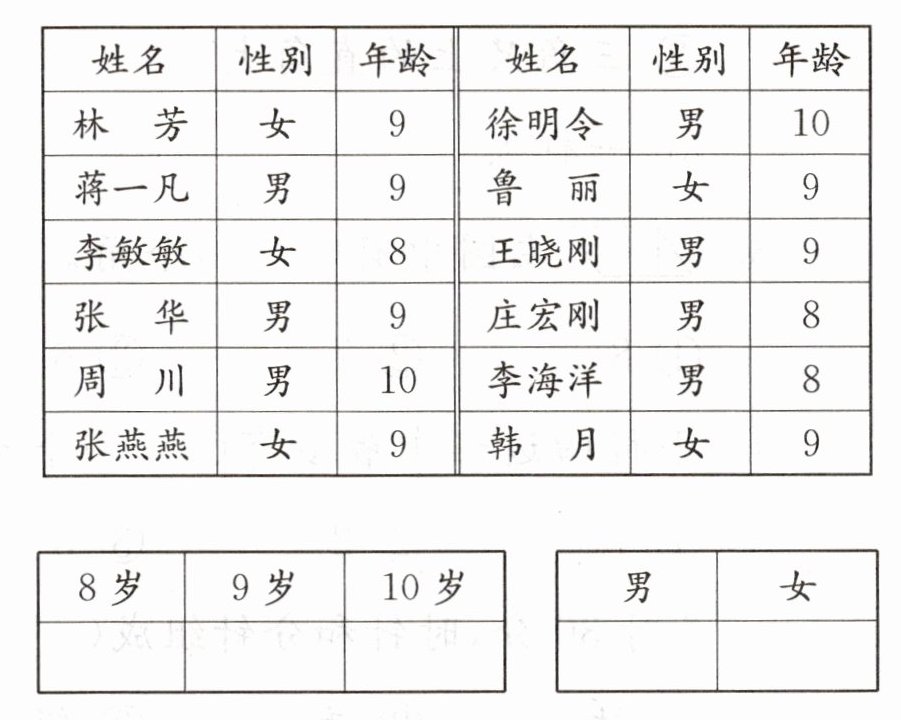 2. 根据二(1)班第一组同学性别、年龄情况记录表,完成下面表格的填写。