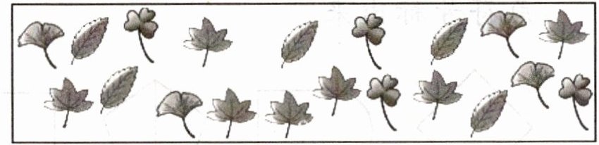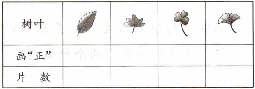 【解析】:通过观察图片,数出每种树叶的数量,一个“正”字代表$5$画。第一种树叶有$5$片,画“正”;第二种树叶有$8$片,画“正 丅”;第三种树叶有$5$片,画“正”;第四种树叶有$4$片,画“丅 丅”。