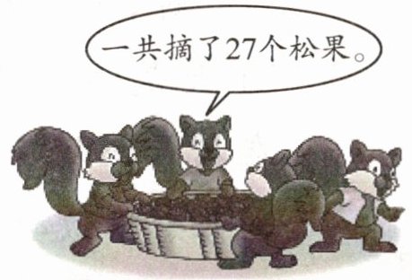 【解析】:从图中可知一共有$27$个松果,小松鼠的数量是$4$只,用松果总数除以小松鼠的数量,即$27\div4 = 6\cdots\cdots3$,其中商$6$就是每只小松鼠分得的松果数,余数$3$就是剩余的松果数。