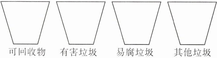 (3)浙江省生活垃圾分为可回收物、有害垃圾、厨余垃圾(易腐垃圾)、其他垃圾四大类, 请你把下列垃圾“放”入对应的垃圾箱中(填序号)。