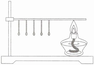 7.小励将一段铁丝固定在铁架台上,他在铁丝上每隔一定距离用蜡粘上一根火柴,用酒精灯在铁丝一端加热(如图所示)。