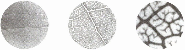 7. 如图分别是用肉眼、放大镜、显微镜观察到的叶片,其中图像大小和视野大小的关系是(