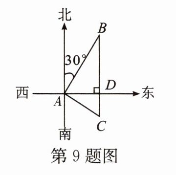 9. 如图,小明从$A$地沿北偏东$30^{\circ}$的方向走了$100\sqrt{3}\mathrm{m}$到达$B$地,再从$B$地向正南方向走了$200\mathrm{m}$到达$C$地,此时小明离$A$地
